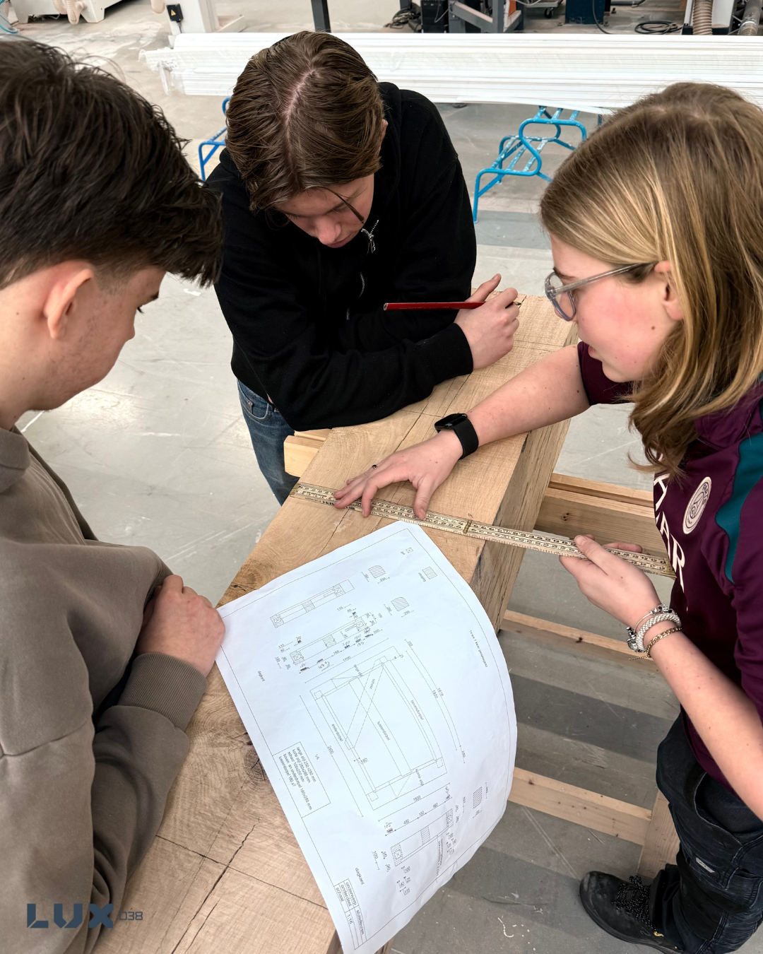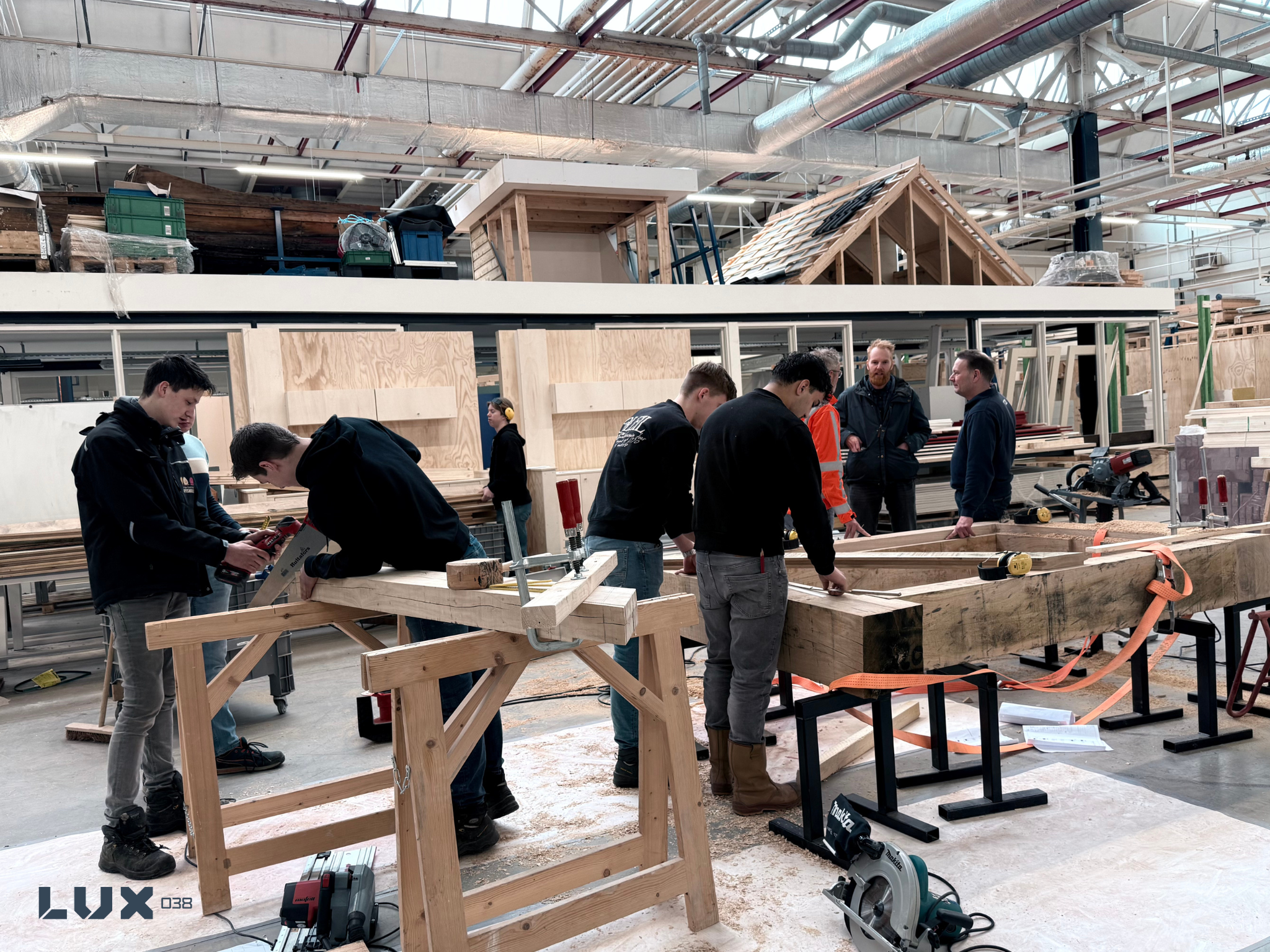 Juist bij LUX038 is zo’n project mogelijk. “Door de bewegingsvrijheid en alle voorzieningen kunnen studenten hier veilig werken,” zegt Niek. “Als je die balken eenmaal uit elkaar haalt, zijn ze niet meer met de hand te tillen. Dan is het fijn dat je een heftruck naast de werkbank hebt.”