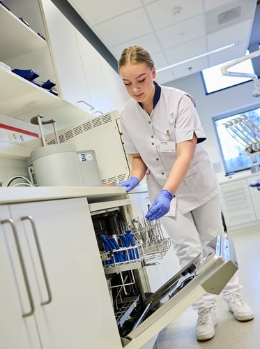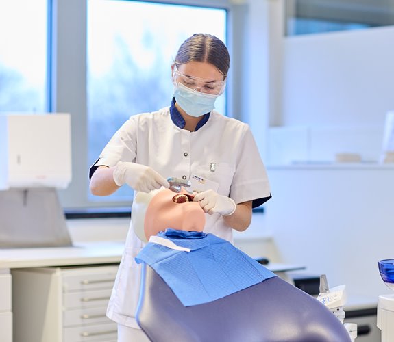 Bij de opleiding gaat zeventig procent van je lestijd over theorie. De rest van de tijd krijg je praktijklessen. Daarin leer je bijvoorbeeld hoe het is om achter de balie te staan en contact te hebben met patiënten. Ook leer je welke handelingen je verricht wanneer je de tandarts assisteert.