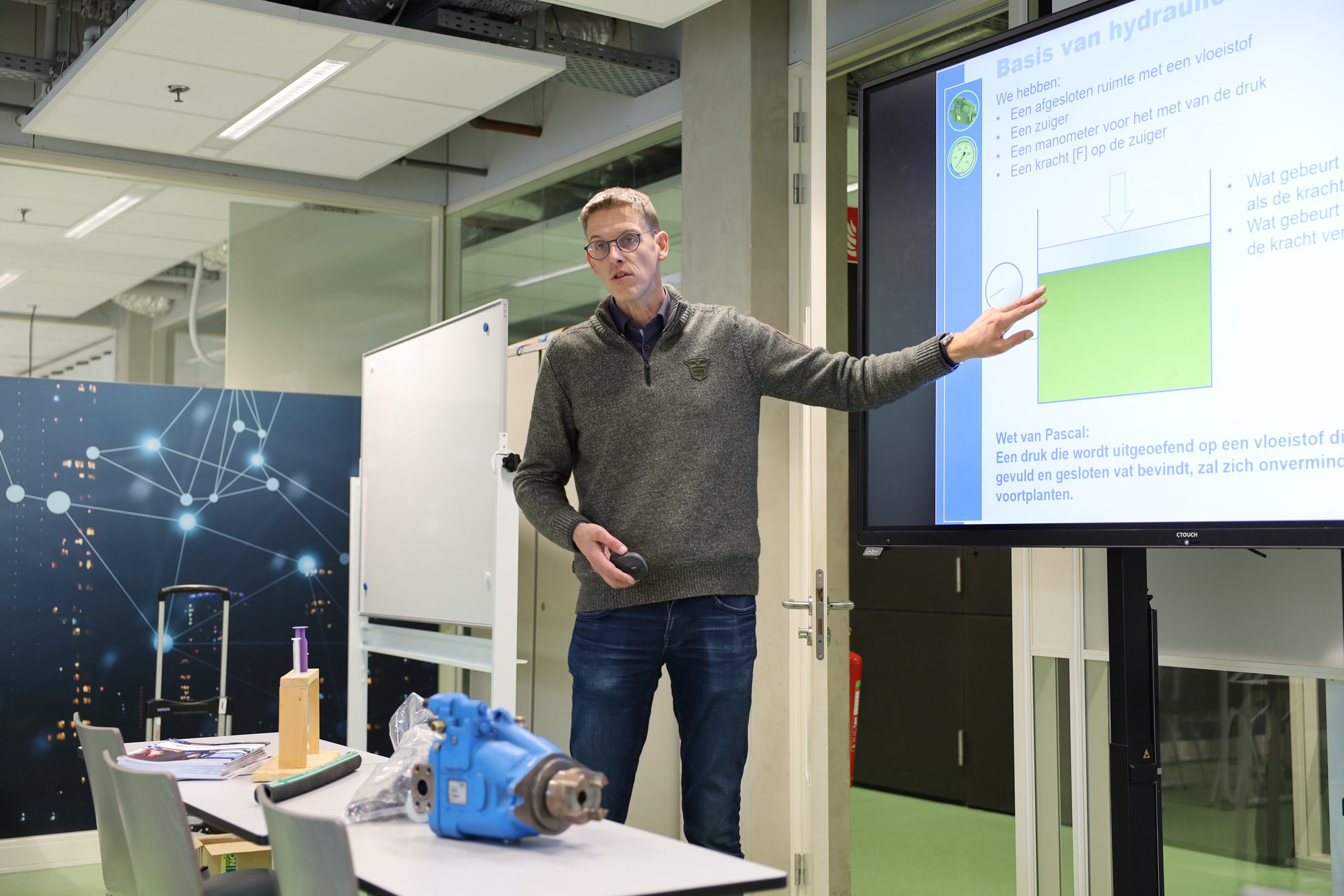 In het najaar van 2025 was de tweedaagse cursus Basis Hydrauliek voor het eerst te volgen bij Deltion voor BBL-studenten en monteurs. De cursus start met theorieles. In het theorielokaal gaat het onder andere over de basisprincipes van hydrauliek, het lezen van een schema en basiscomponenten als pompen, ventielen en cilinders.
